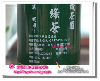 永峰有機茶園有機自然綠茶的鐵罐子很可愛,鐵蓋上面貼有有機農產品認證貼紙和成大綠色產品檢驗盒的貼紙,三太子開心一整個就是安心啦!而且,為了可以好好保存茶葉,鐵罐使採用雙蓋的方式。就是說,裡面還有一個鐵蓋。